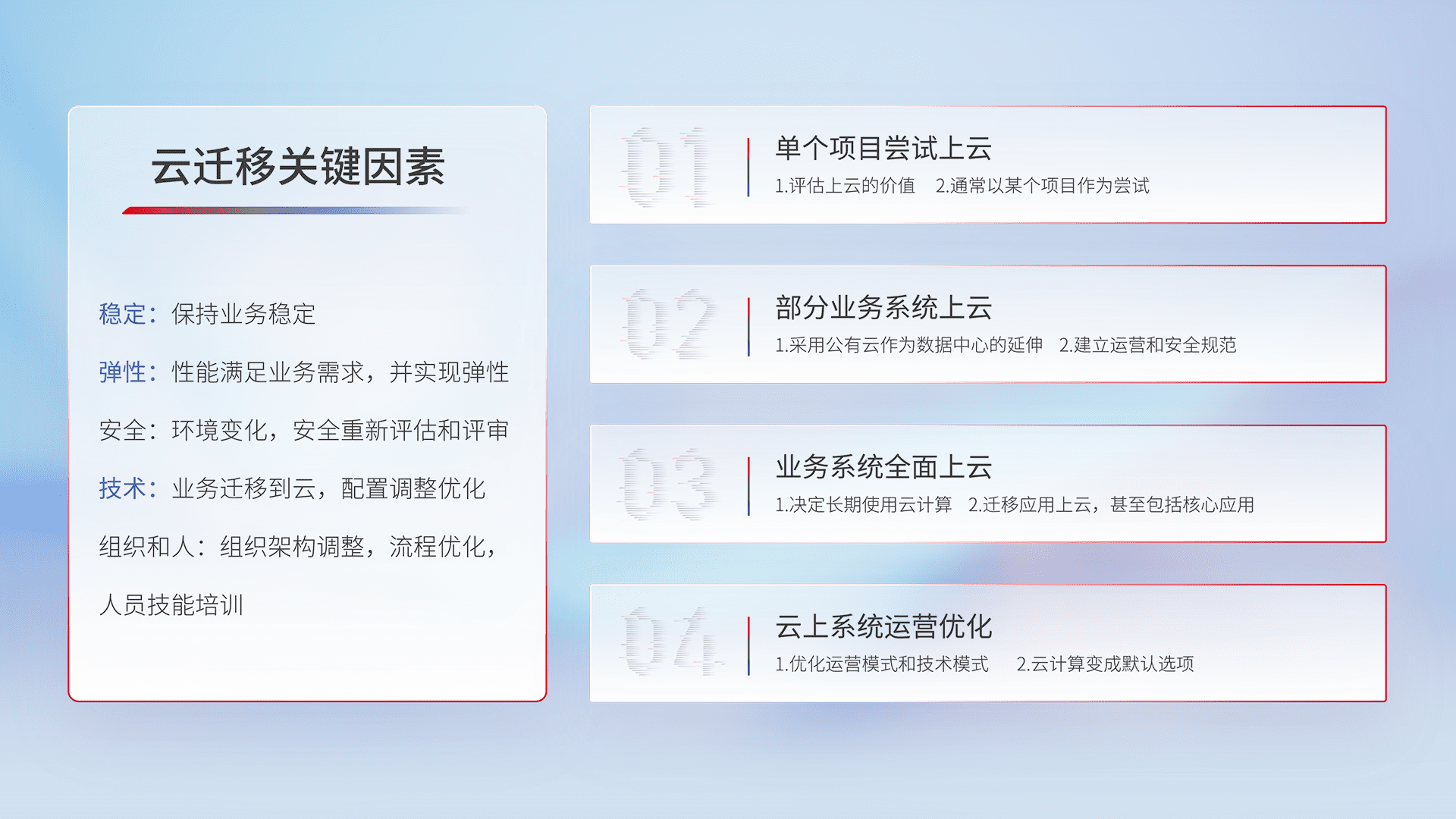 结合实际业务,,,,从规划设计、、云平台选型、、、、云原生改造、、数据迁移、、、、集成交付,,迁移全过程为客户识别最佳上云路径,,,做好风险识别管理,,,,设计网络架构、、、、身份权限、、、安全审计合规、、、操作审计、、、日志审计、、监控告警策略、、、、多站点容灾设计等,,对云上基础设施进行整体规划,,,提升IT治理水平,,,,以满足弹性、、、、高可用、、、、高性能的需求。。。